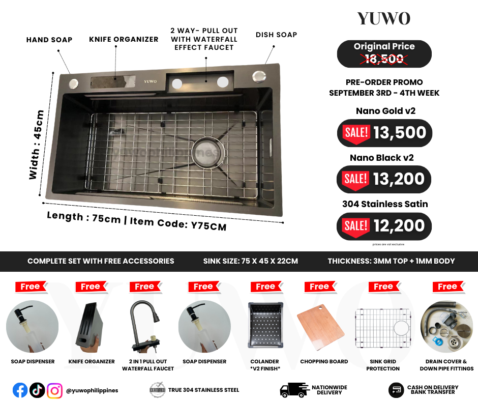 Elevate your kitchen experience with the YUWO Modern Sink 75x48cm Version 2, a harmonious blend of contemporary design and exceptional functionality. Crafted from premium 304 stainless steel and enhanced with Nano PVD coating, this sink offers a sleek, scratch-resistant finish available in Nano Black, or classic Stainless Steel.